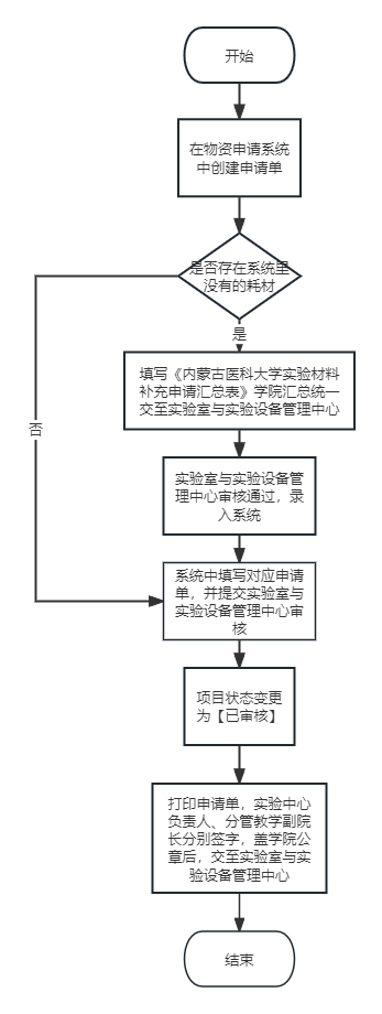 (三)2024年6月25日下午5:00前,各实验教学中心按教学计划、实验课教学大纲要求,在物资申请系统中填报内蒙古医科大学实验材料申请(申请流程及注意事项详见附件1),并提交审核。