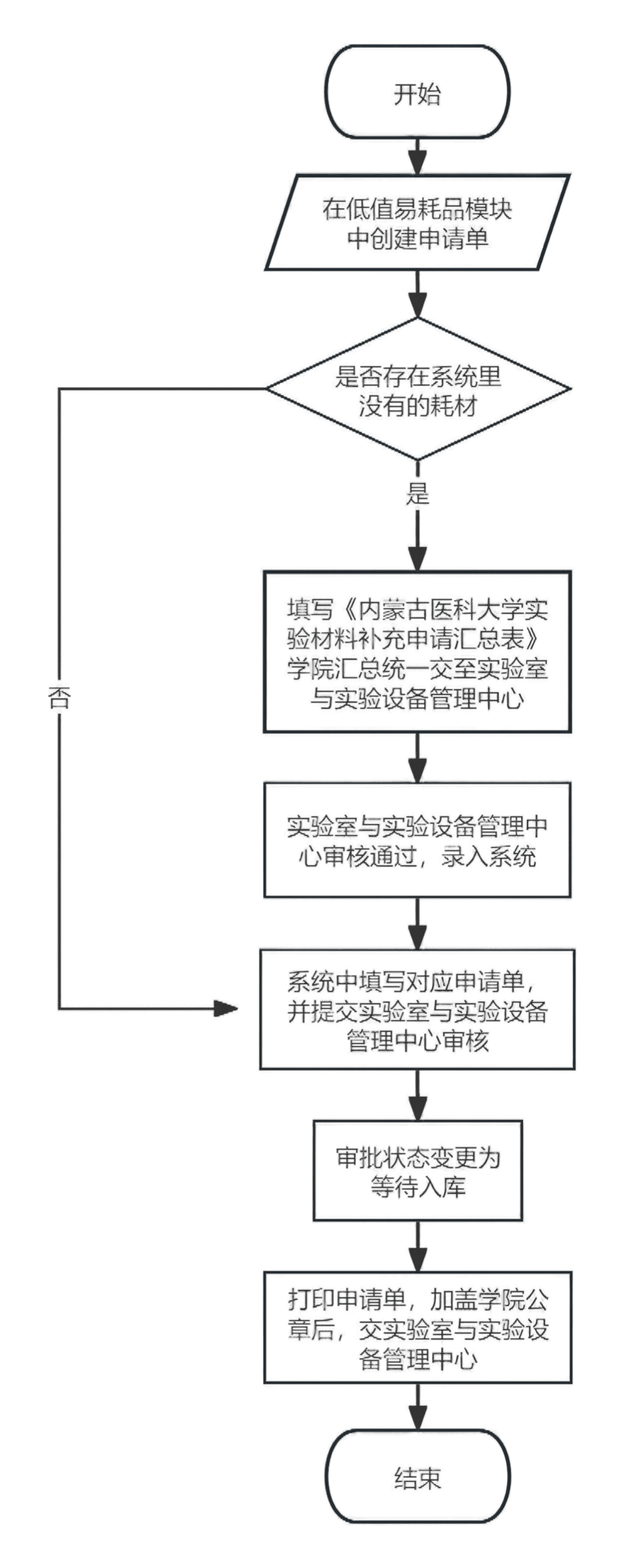 (二)如需添加系统中未包含的本专科教学所用实验试剂耗材,申请教师应根据所需补充试剂和耗材的明细信息填写《内蒙古医科大学实验材料补充申请汇总表》(附件4),并在规定时间内提交至所属学院(部门),学院汇总后,于2025年9月30日下午5:00前,将《内蒙古医科大学实验材料补充申请汇总表》(附件4)电子版发送至邮箱syshcgl@163.com。纸质版签字盖章后,由学院统一交送至实验室与实验设备管理中心(精诚楼614)。